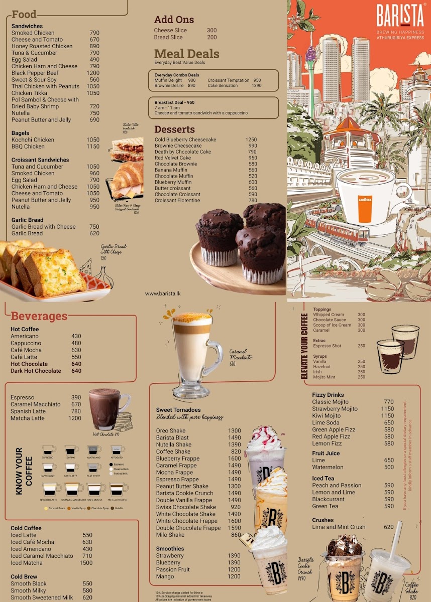 The menu at Barista Yakkala primarily features a selection of coffee and other hot beverages, complemented by a variety of light food options. Visitors can find standard and specialty coffee drinks, including espresso-based beverages and cocoa-based hot drinks. The food offerings include sandwiches, garlic bread, and other light bites suitable for quick meals or snacks.